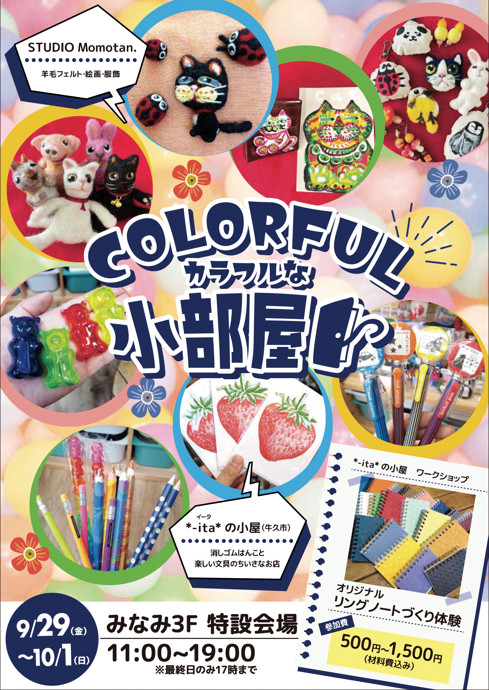 愛らしいネコが目印! 羊毛フェルトや絵画を制作する「STUDIO Momotan.」さんと消しゴムはんこと楽しい文具を製作する「*-ita*の部屋」さんが出店♪*-ita*の部屋さんはオリジナルリングノートのワークショップも行います。お待ちしております!