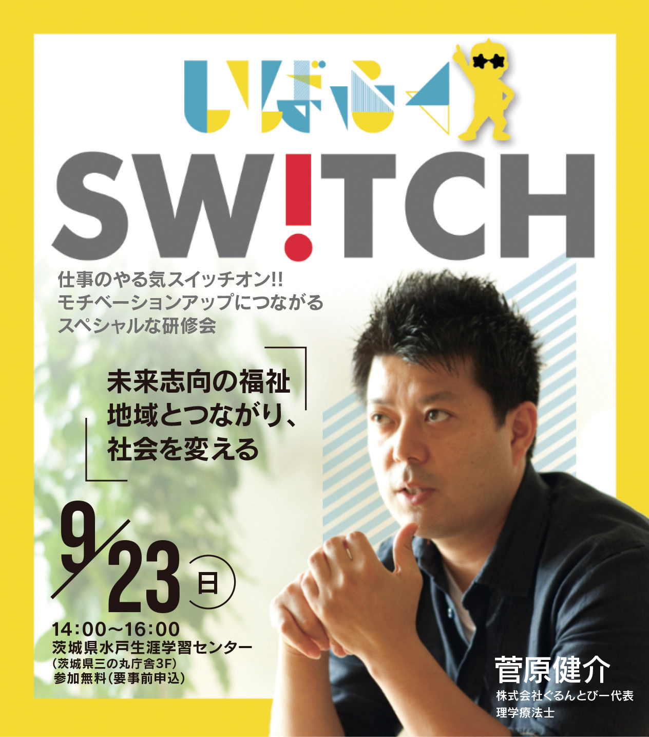 仕事のやる気スイッチオン!!モチベーションアップにつながるスペシャルな研修会SWITCH。「未来志向の福祉 地域とつながり、社会を変える」と題して、理学療法士として活躍する菅原健介さん(株式会社ぐるんとびー代表)をお呼びしてのトーク&ワークを行います。福祉、まちづくりに興味のある方ぜひご参加ください。